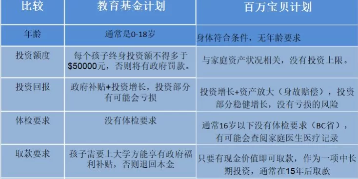 和我们通常了解的RESP教育基金计划不同,这个计划没有$50,000的限制,也没有规定一定要用于孩子的大学学费。百万宝贝计划同时具备了保障本金, 投资回报稳定,只涨不跌的特性, 在理财规划上做到了让人安心、省心。我们可以看看两个计划的差异。